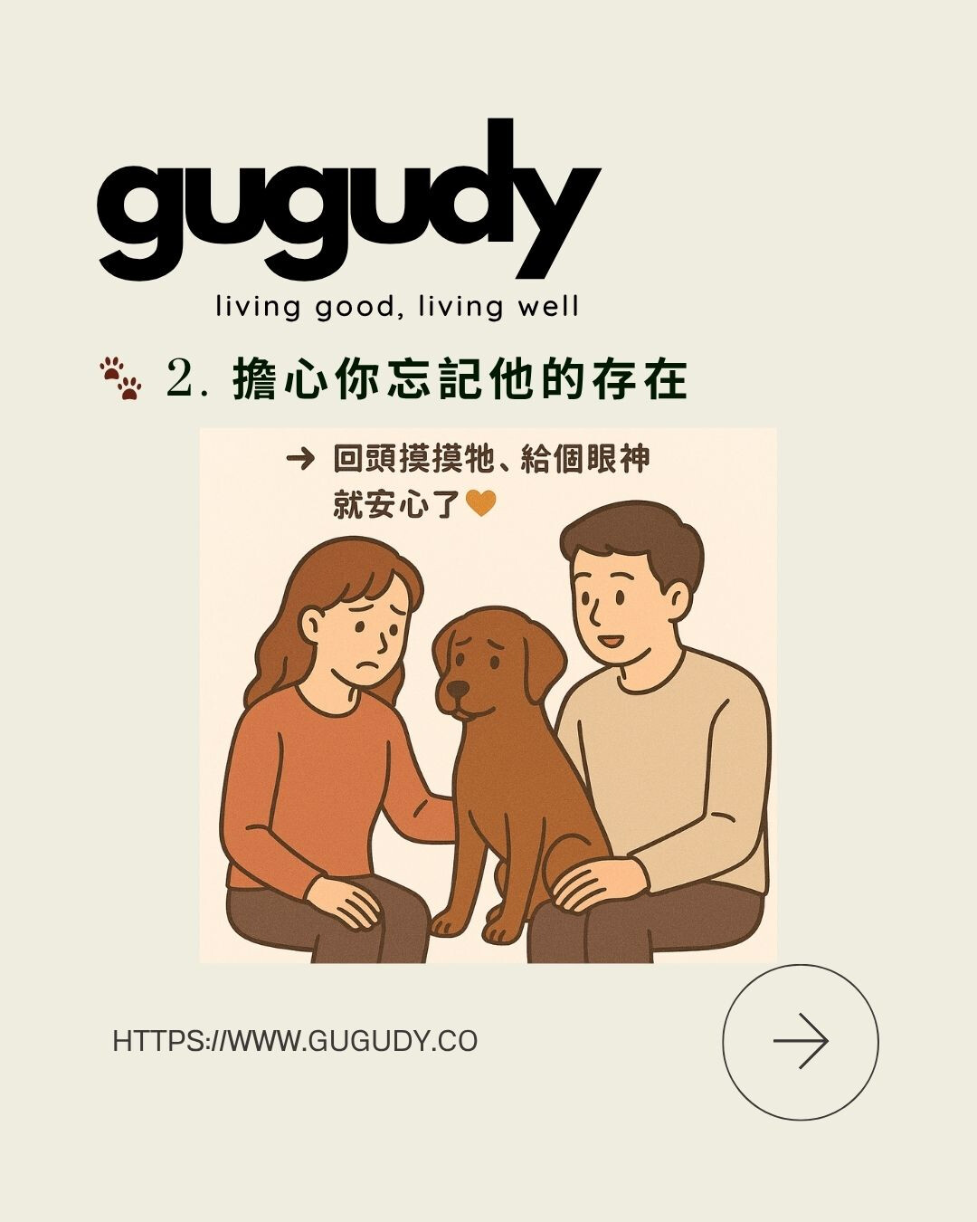 看到你和別人聊得太開心,他可能覺得被忽略。只要回頭看他一眼、輕輕摸摸頭,狗狗的心就會立刻放鬆許多~