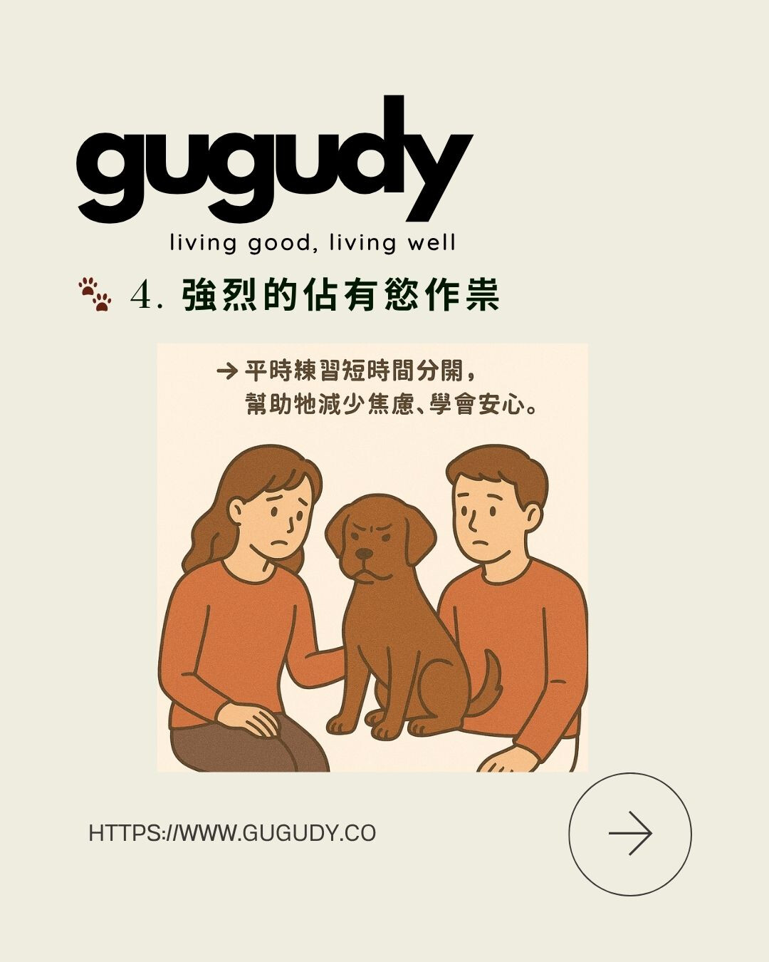 若平常狗狗獨自在家會焦慮、亂叫,代表有「分離焦慮」傾向,可以逐步練習短時間分開,幫助他更有安全感。