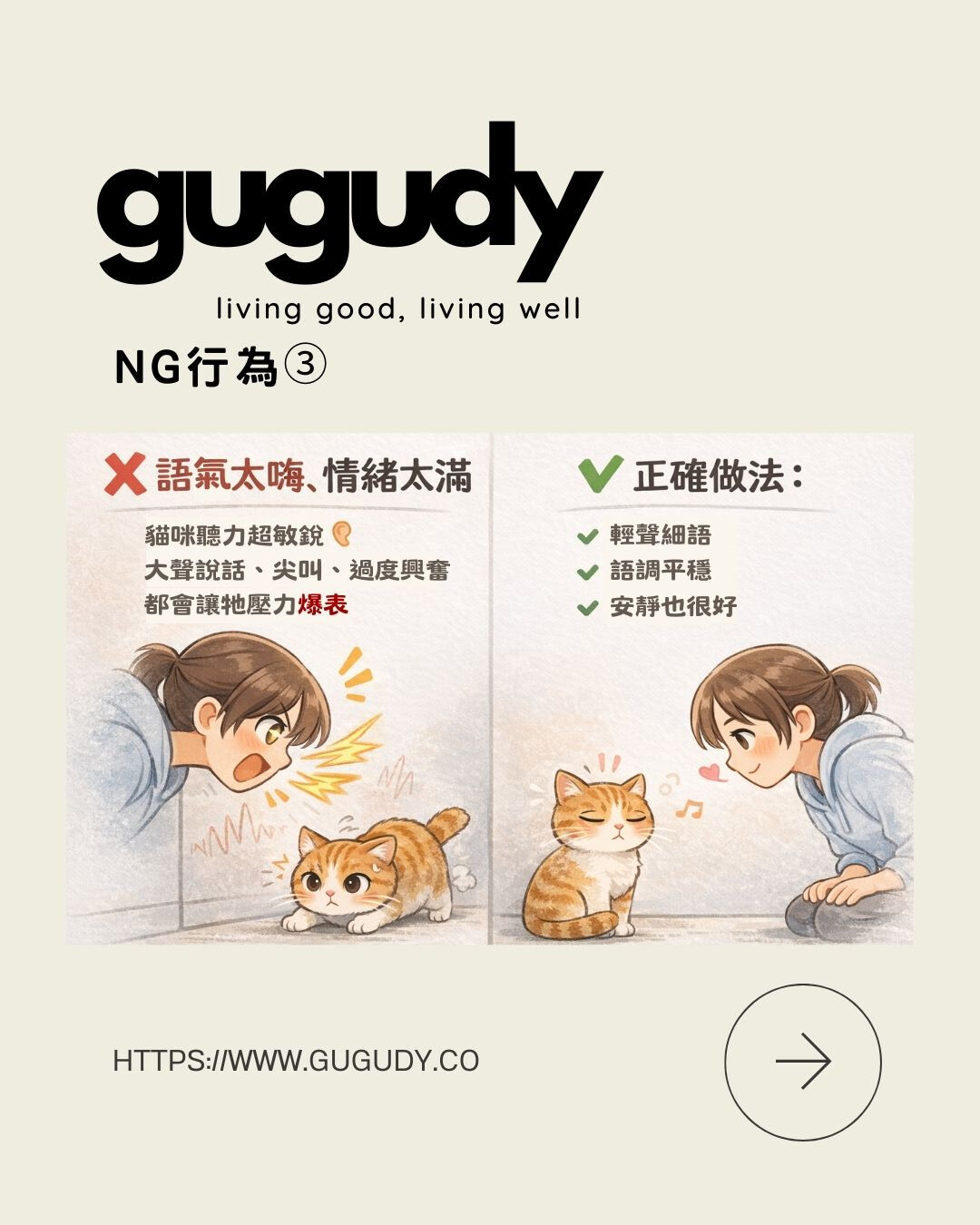 貓咪的聽力非常敏銳,大聲說話、突然尖叫或過度興奮的語氣,都可能讓他壓力爆表。
